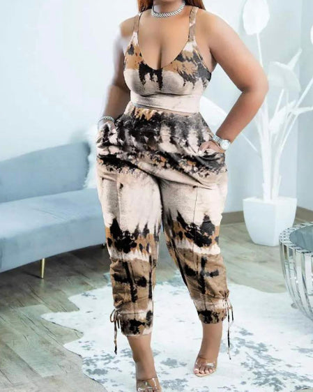 This daring two-piece set features a vibrant tie-dye crop top paired with comfortable pants equipped with pockets. Perfect for making a bold statement.