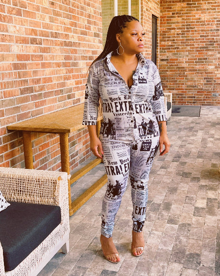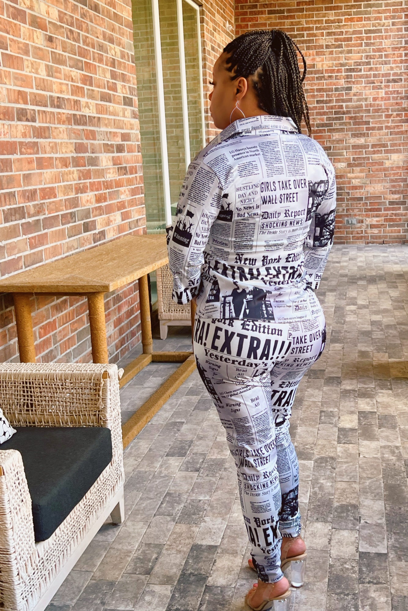 Get ready to turn heads with the Creative Letters Dup two-piece set! Featuring a fun newspaper print, this playful outfit adds a quirky twist to your wardrobe.